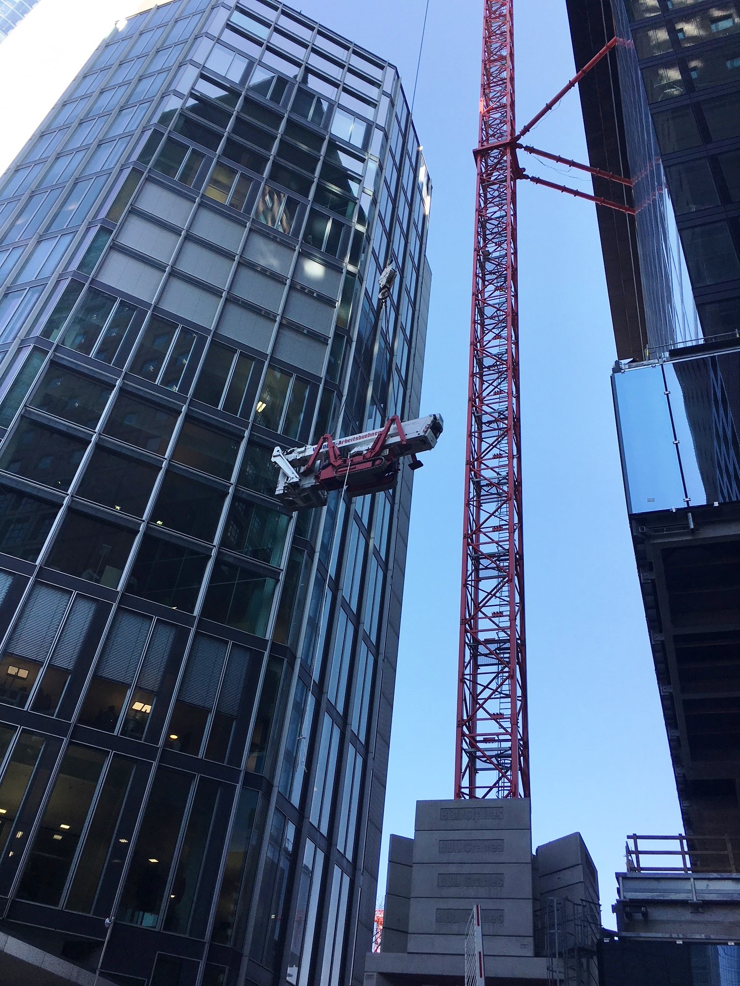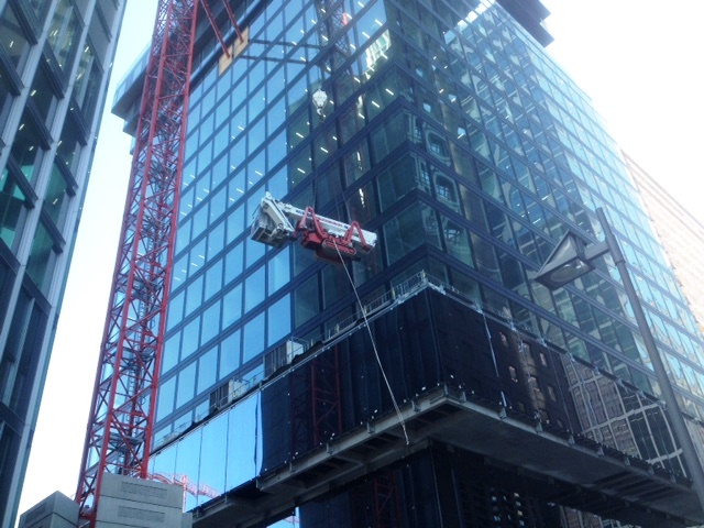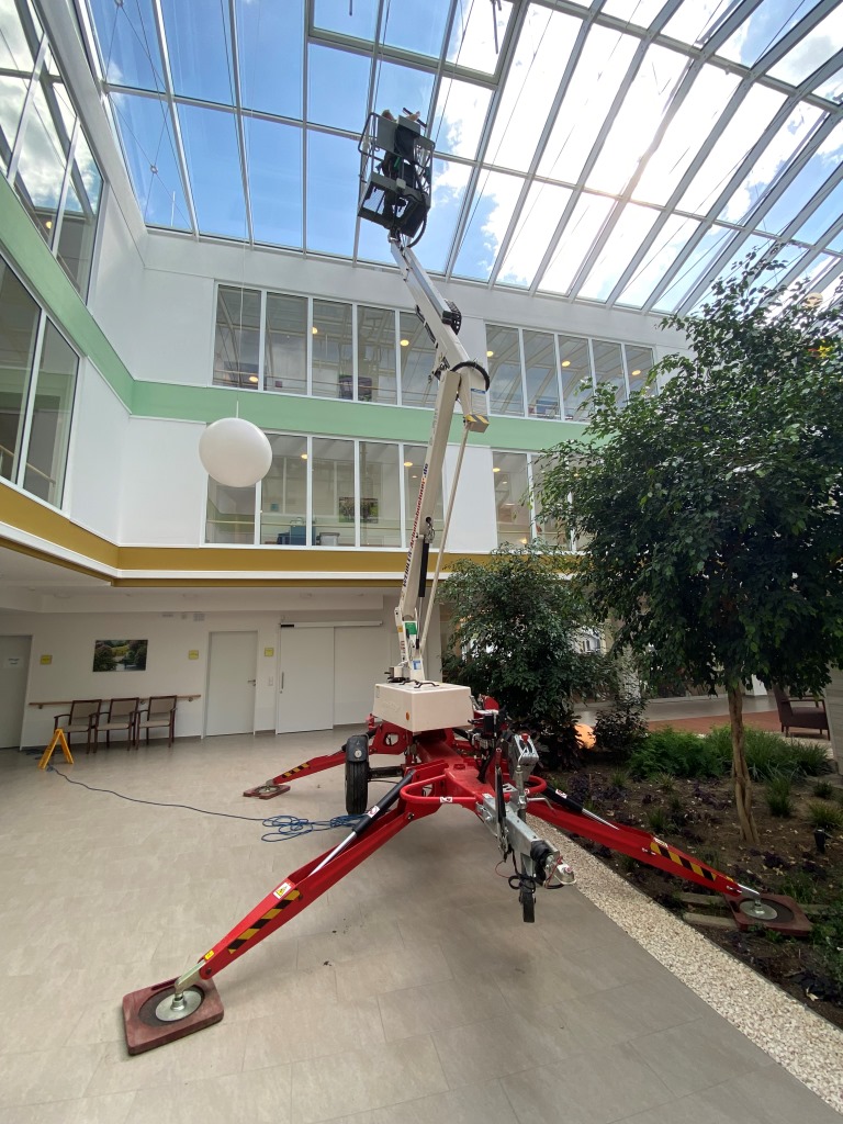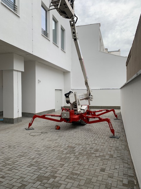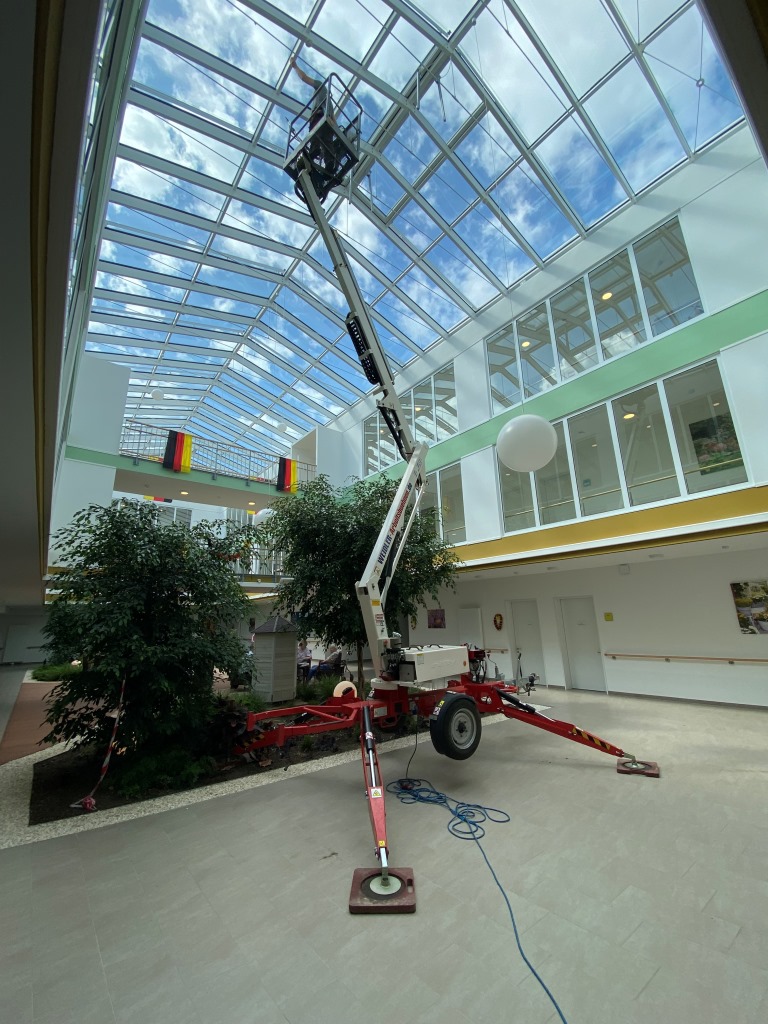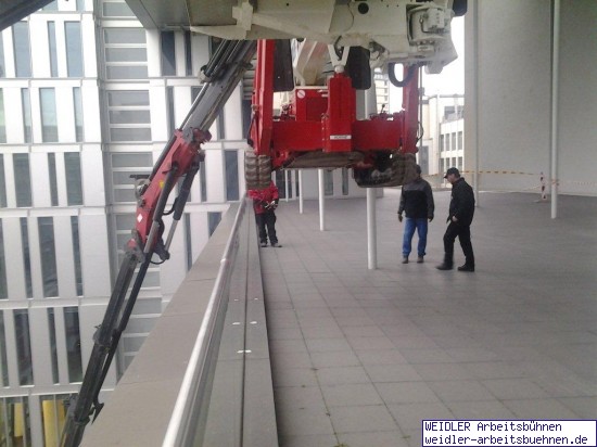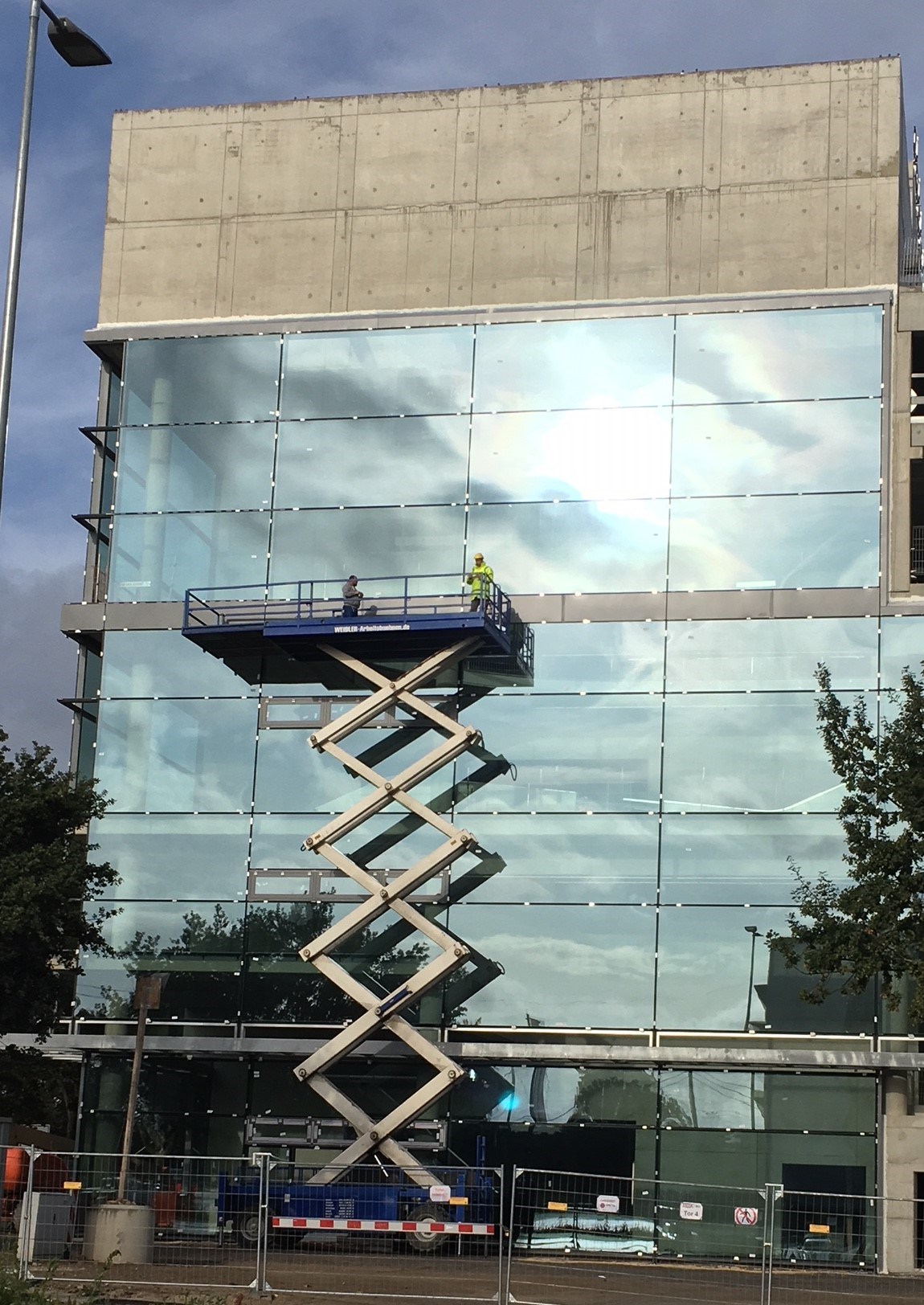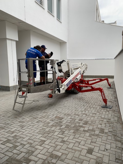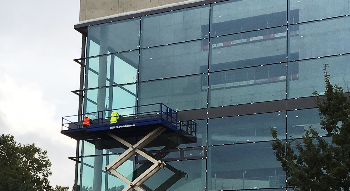 Die Mitarbeiter der FA. STRABAG Property & Facility nutzten ihn von dort aus, um Ihre Reinigungsarbeiten sicher und in jedem Winkel der hohen Fensterfront durchführen zu können.