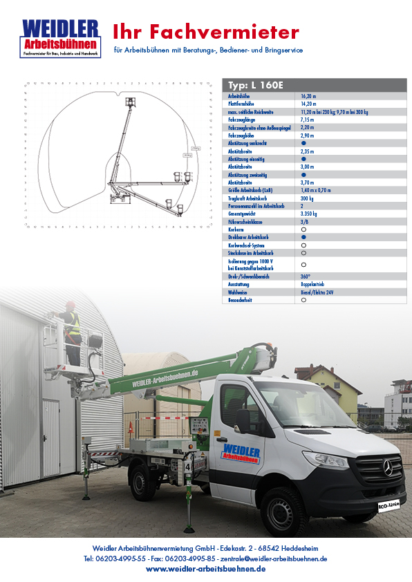 Mit einer Arbeitshöhe von 16,20 m, seitlicher Reichweite von bis zu 14,20 m und einer Tragkraft im Arbeitskorb von 300 kg bietet Ihnen unsere neue LKW-Arbeitsbühne ein Allround Paket an vielfältigsten Einsatzmöglichkeiten.