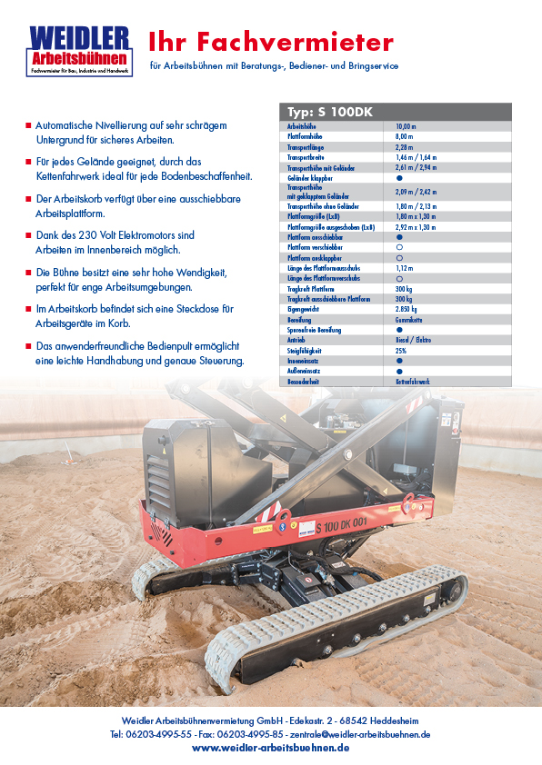 Mit unserer neuen Scheren-Arbeitsbühne arbeiten Sie im Außenbereich effizient und komfortabel bis zu 10 m Arbeitshöhe an Wand und Decke. Die Plattform können Sie ausziehen, dies bietet Ihnen ausreichend Platz für Personen, Material und Werkzeug. Durch ihr Kettenfahrwerk bewegt sich unsere Scheren-Arbeitsbühne im unebenen Gelände wie ein Fisch durchs Wasser. Zusätzlich sorgt die automatische Nivellierung für sicheres Arbeiten und leichte Bedienung. Gerne beraten wir Sie persönlich und erstellen Ihnen ein Angebot.