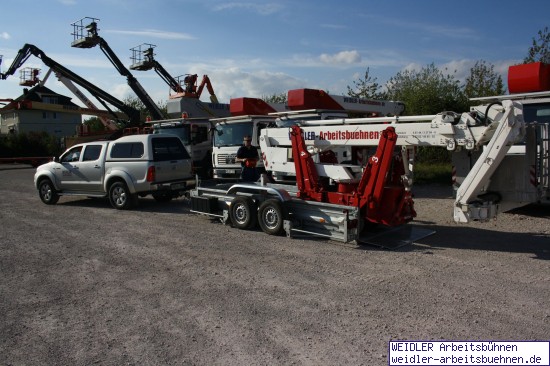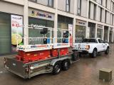 Durch dessen Vermietung ermöglichen wir es unseren Kunden zukünftig Bühnen bis zu einem Gewicht von 2420 kg selbst abzuholen. Die Auf- und Abladung der Bühnen wird durch seine hydraulische Pumpfunktion und Absenkfunktion stark erleichtert.